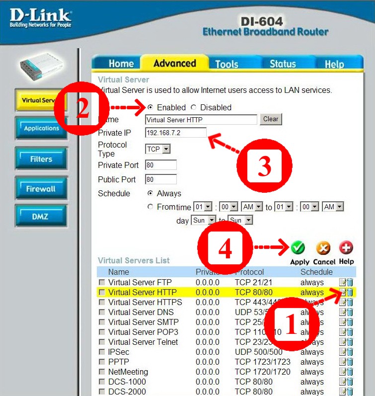 Теперь нажимаем закладку Advanced. Поскольку программисты D-Link уже сделали для нас заготовку для маппинга 80 порта веб-сервера (Virtual Server HTTP), то выбираем его, кликнув по иконке редактирования (на скриншоте стрелочка обозначена цифрой 1).